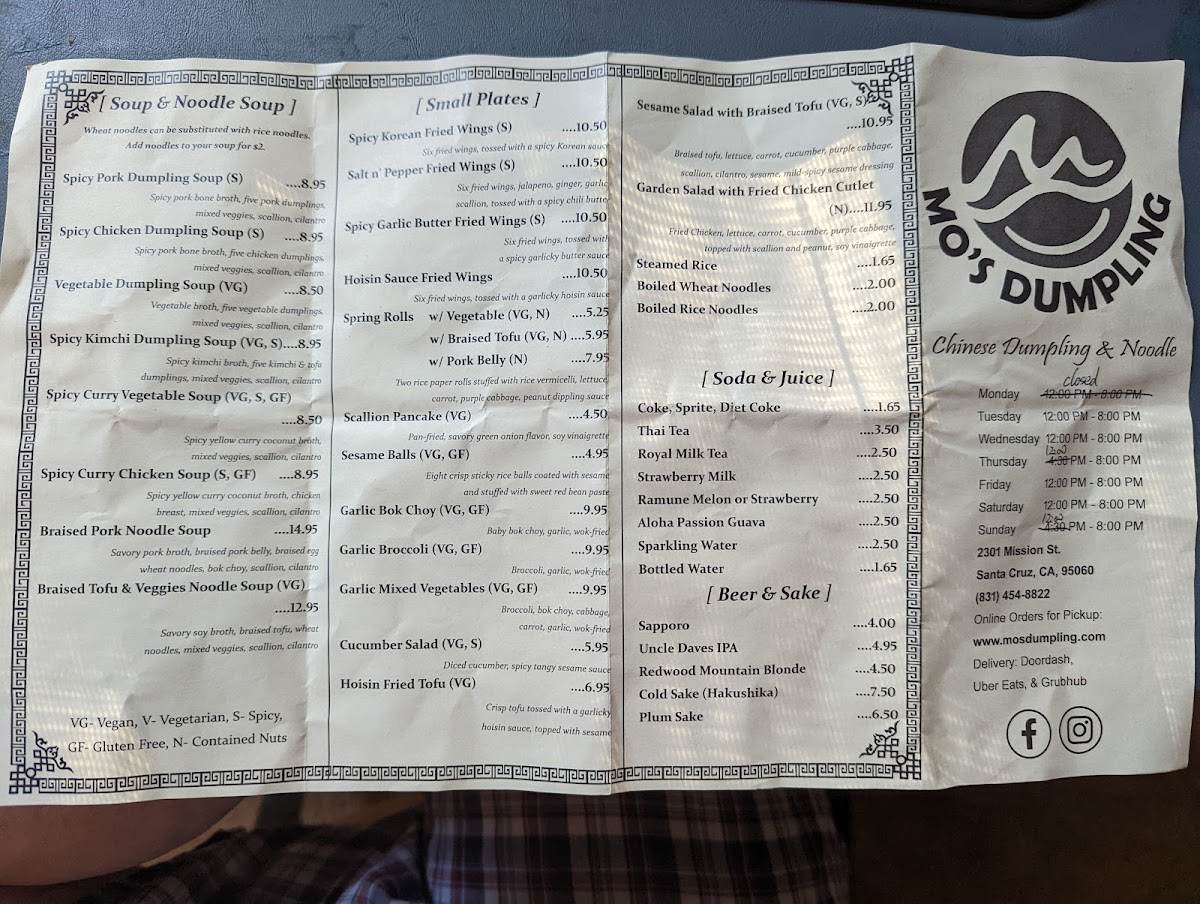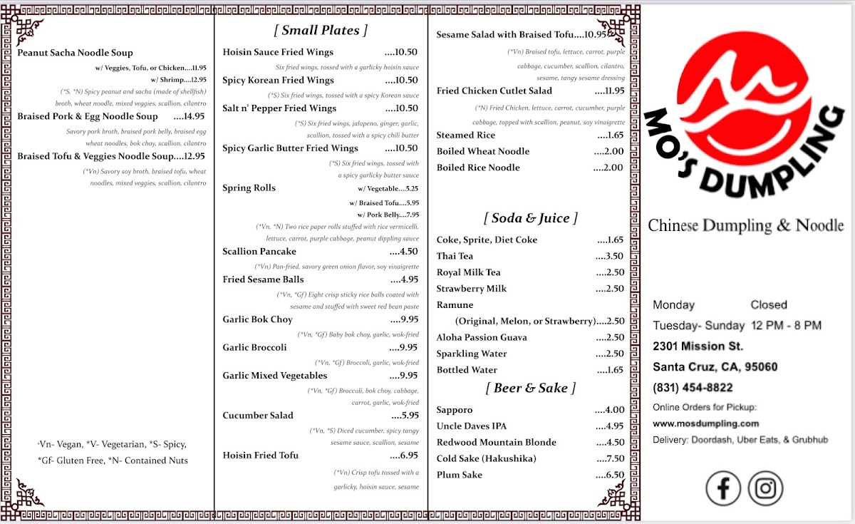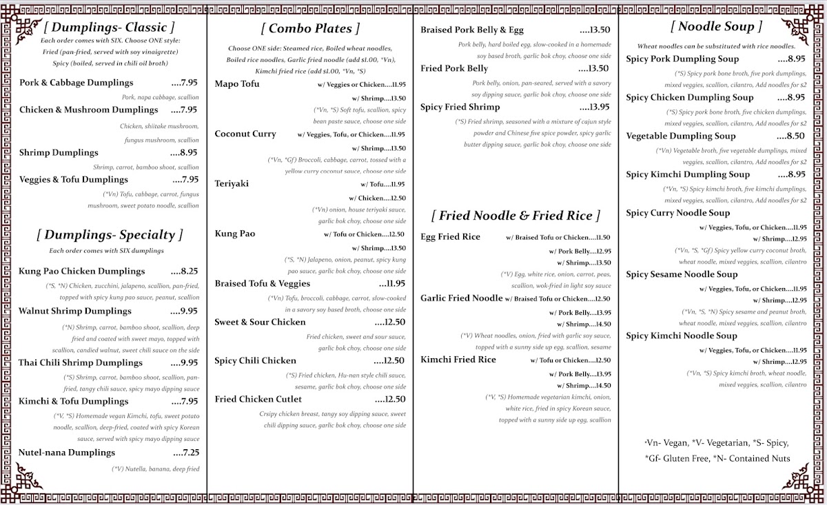 The menu accommodates different meal occasions, suitable for quick orders or casual dining experiences. Customers can expect a balance of meat, seafood, and vegetarian options, with a variety of flavor profiles including spicy, savory, and tangy dishes. The menu offers flexibility for individual tastes and dietary considerations within the framework of dumpling, noodle, and soup specialties.